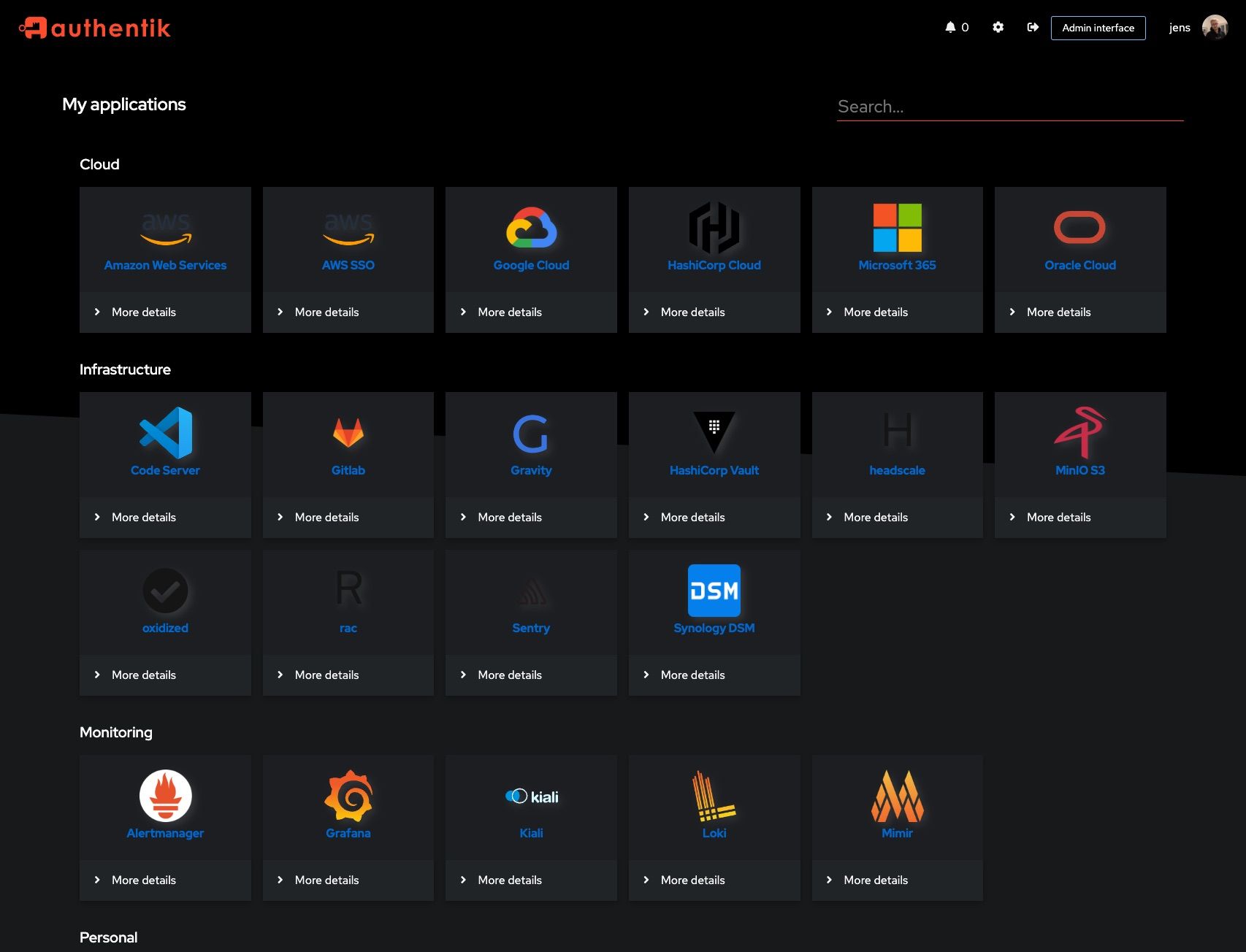 User interface: this console view in authentik displays all of the applications and integrations in which you have implemented authentik. Click on the app that you want to access to open it, or drill down to edit its configuration in the admin interface.